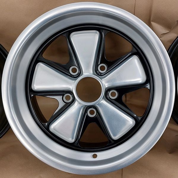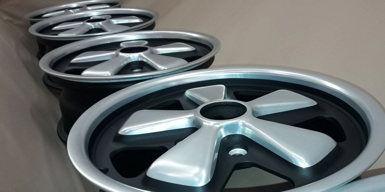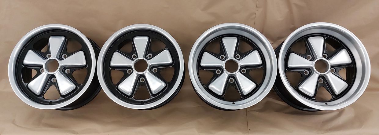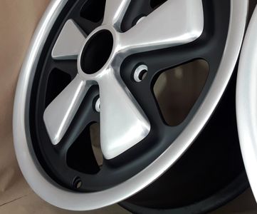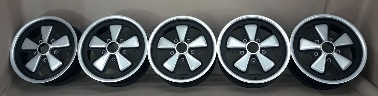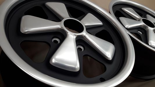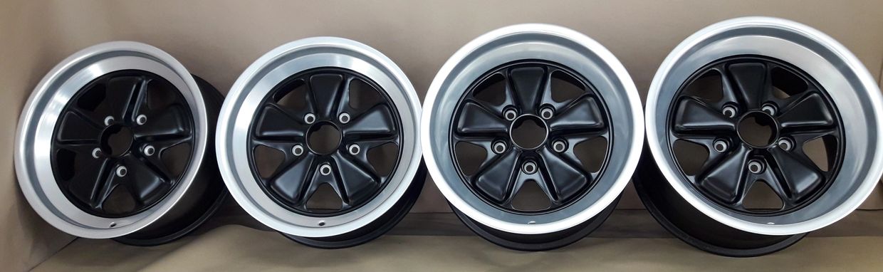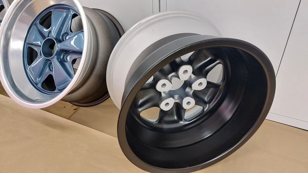 Post-anodising, the wheels are then treated to robust 2K paint in the correct black finish between the petals as per original factory pattern, unique and different for 4.5J, 5.5J or 6J x 15" deep-six or flat-six wheels, and different again for the later generation 16" wheel series.