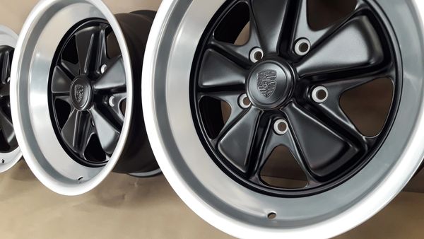 Satin black finish applied across the entire central petal area, characteristic of the appearance of all standard factory Fuchs used on impact bumper G-series cars from 1974 through to 1989.