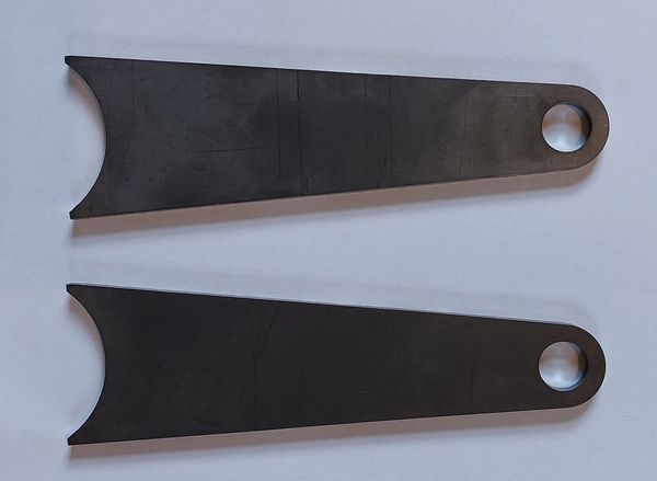 The arms are laser-cut from 5mm mild steel for welding on to the lower part of the suspension strut tube, providing reinforcement to the spindle arm above. Typically required on raised-spindle or otherwise lowered suspension cars with tie-rod height lowered relative to the spindle to reduce bump-steer.